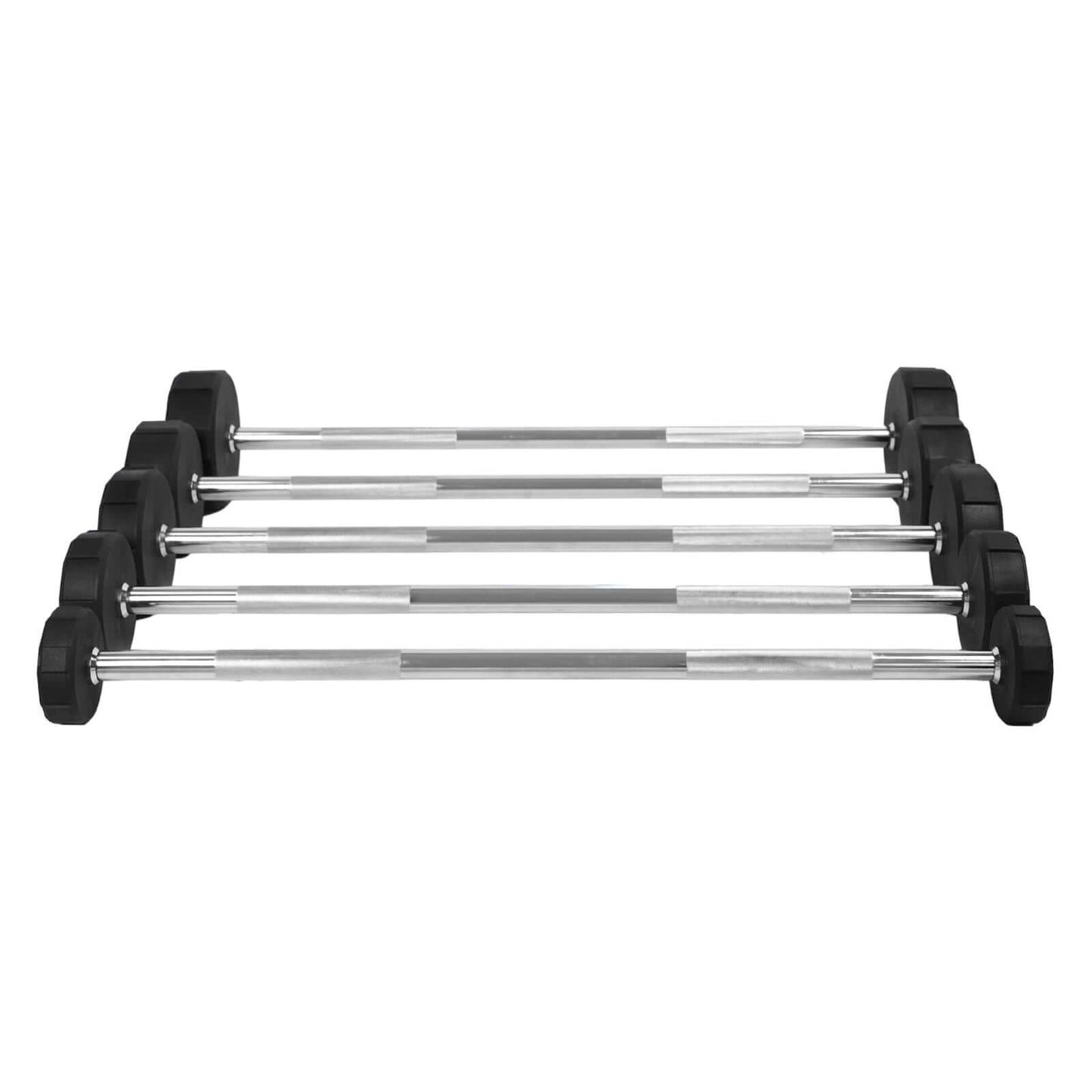 Our steel Fixed Barbells are coated with Chrome and sport a standard knurl. Your bar will be protected from rust and abrasions and you’ll have a great grip. Ends are covered in protective rubber, saving your bar from damage should any drops occur!