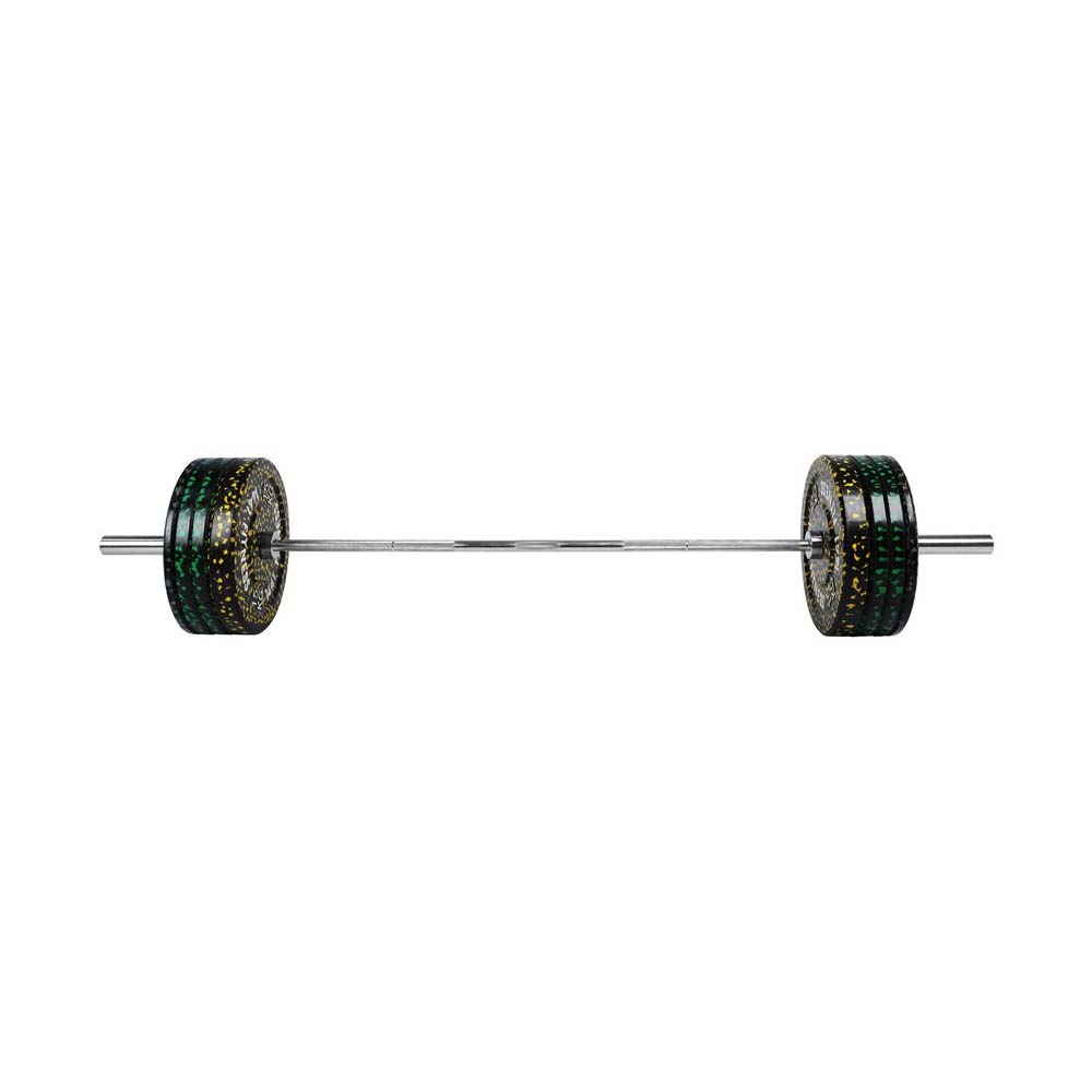 The 100 Kg Olympic Camouflage Bumper Plates with Barbell is designed to work out the whole body, from legs and back when squatting to arms and abdominal when performing chest press.