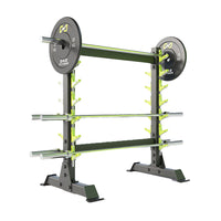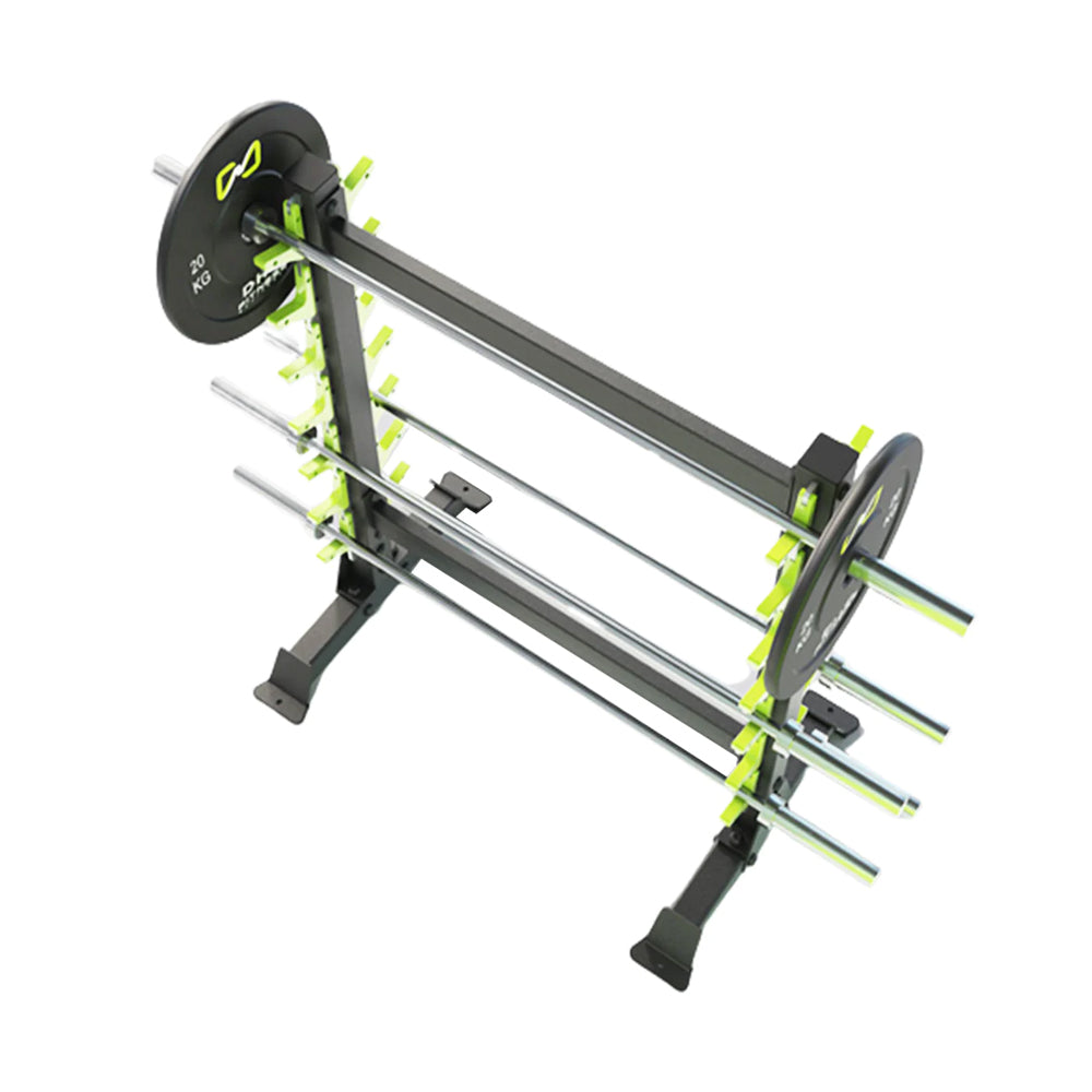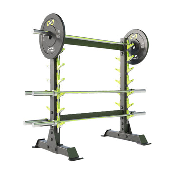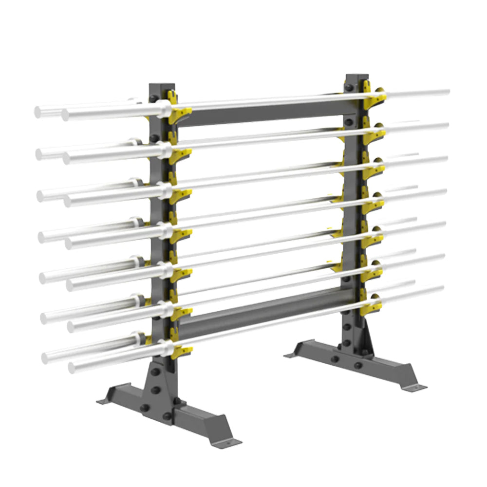 The DHZ Fitness Olympic Bar Rack - 41FE6231 has double-sided design, with a total of 14 pairs of Olympic bar catches, provides more storage capacity in a smaller footprint, and the open design allows easy access.